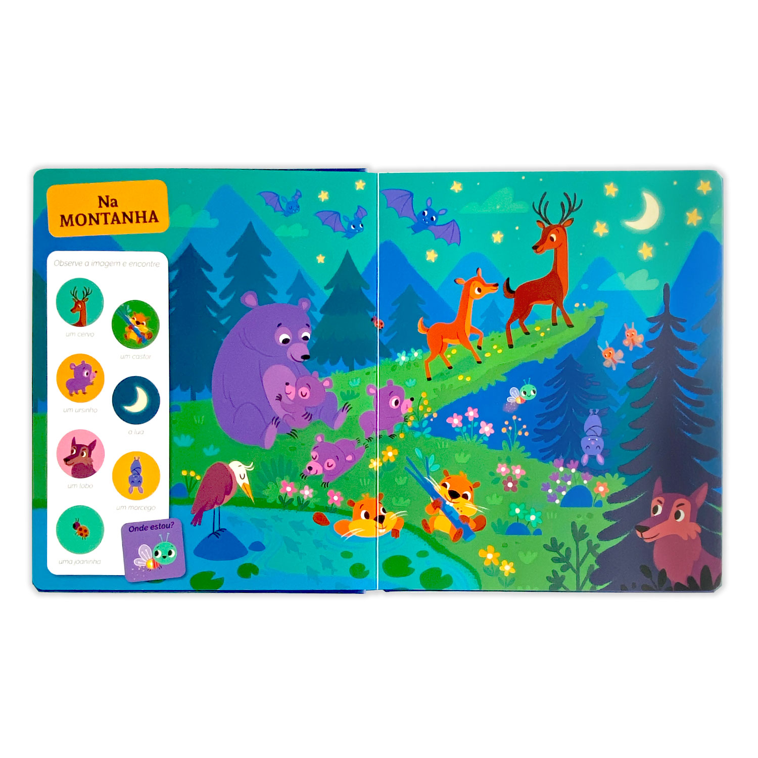 Explore o mundo ao anoitecer em 9 pranchas repletas de detalhes. Observe com atenção e, com a ajuda do verniz fosforescente, encontre 7 elementos escondidos em cada página!
